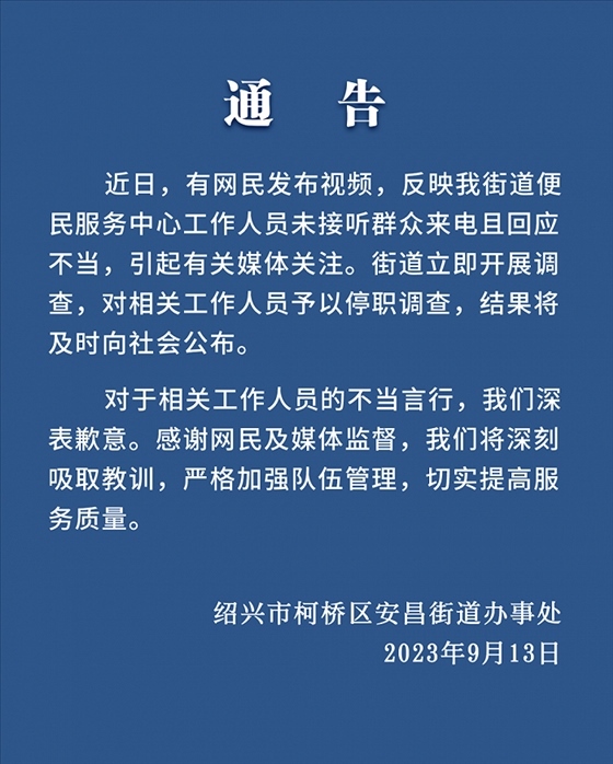 ·浙江紹興有市民發(fā)視頻稱,打不通安昌便民中心電話,來(lái)到現(xiàn)場(chǎng)發(fā)現(xiàn)工作人員都在聊天,吐槽電話是擺設(shè)。官方通報(bào):相關(guān)工作人員停職調(diào)查。