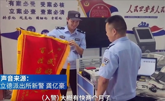 9月5日,安徽亳州。立德派出所新警龔億豪幫助轄區(qū)群眾找回失物,收到群眾送來(lái)的錦旗后,龔億豪開(kāi)心地向同事“炫耀”,秒變“顯眼包”。
