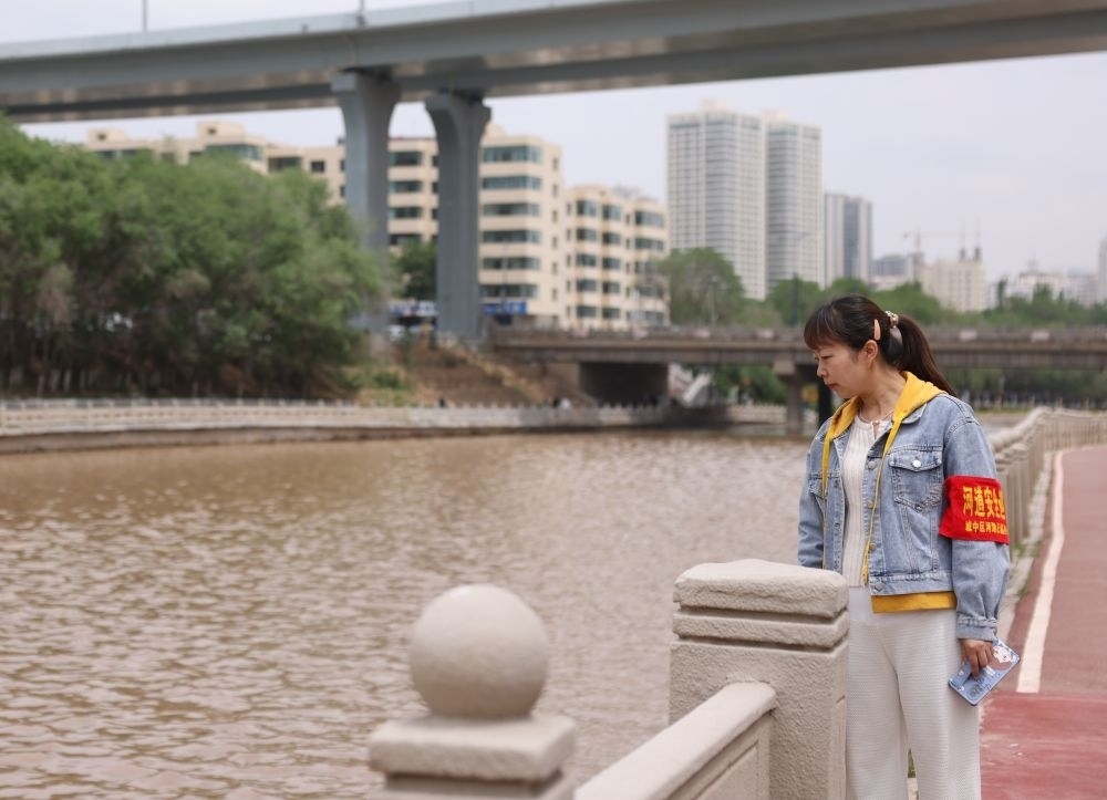 6月3日,在西寧市南川河沿岸,社區(qū)河長(zhǎng)蔣曉蕓正在巡河。新華社記者李寧 攝