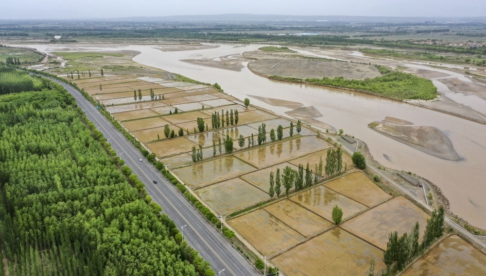 流經(jīng)寧夏青銅峽市境內(nèi)的黃河,滋潤(rùn)著岸邊水稻和各種植被(無(wú)人機(jī)照片,5月25日攝)。新華社記者馮開華 攝