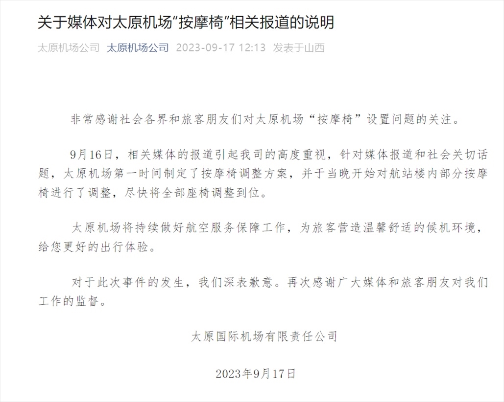 ·太原機場回應(yīng)“部分登機口全是按摩椅”:將在19日調(diào)整完畢。