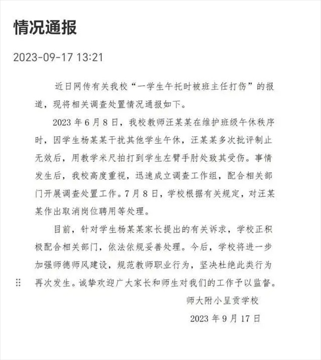 ·昆明一小學(xué)通報“學(xué)生午托時被班主任打傷”:涉事老師取消崗位聘用。