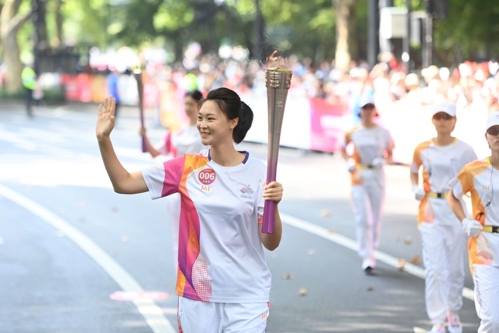 ↑火炬手司燁儀在火炬?zhèn)鬟f中。
