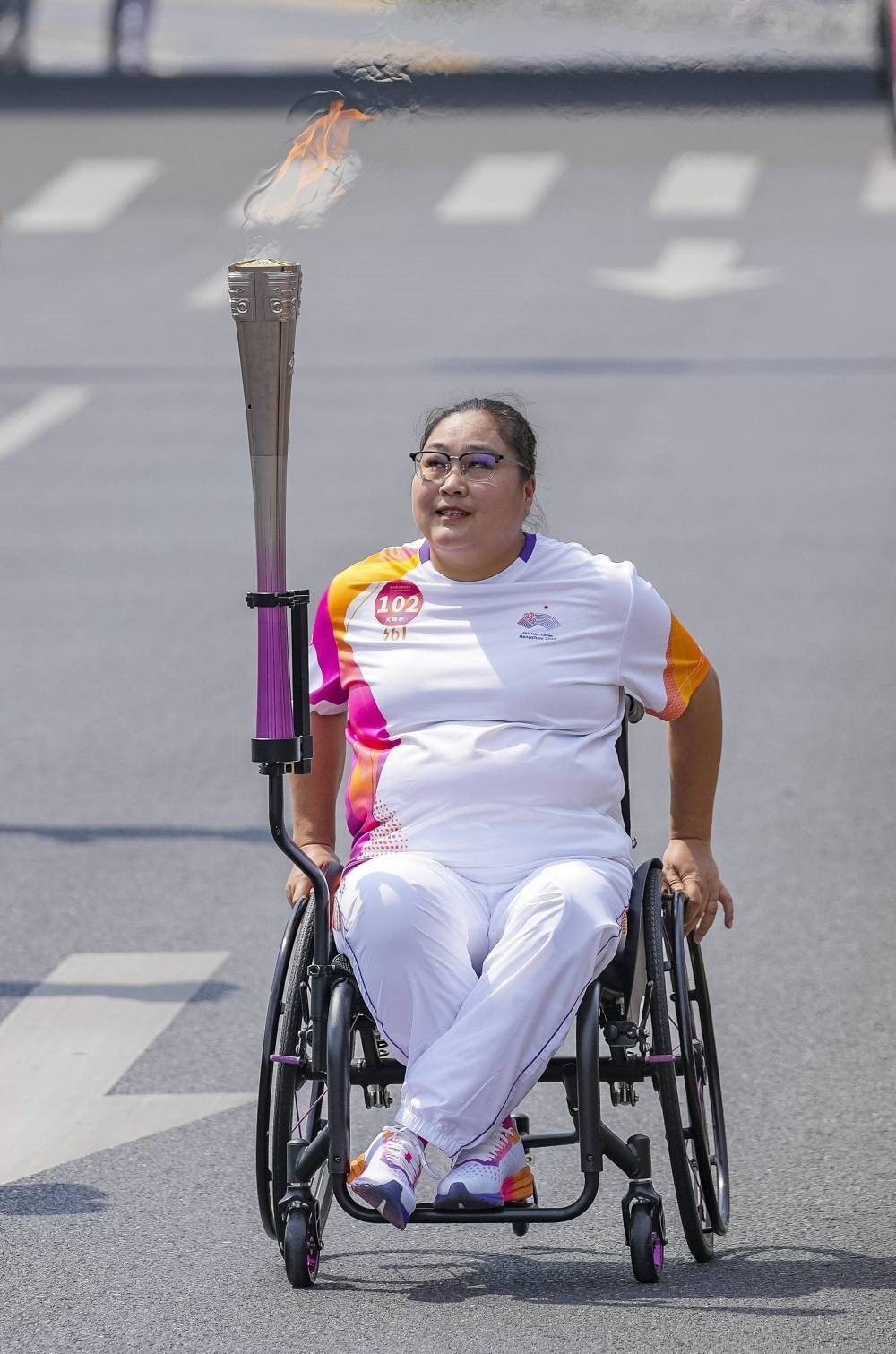 ↑火炬手婁小仙在火炬?zhèn)鬟f中。