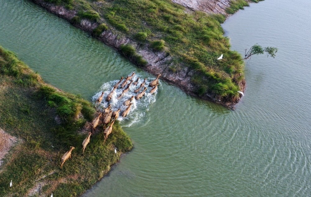 一群麋鹿在江蘇大豐麋鹿國家級自然保護(hù)區(qū)野鹿蕩渡河(無人機(jī)照片,8月20日攝)。