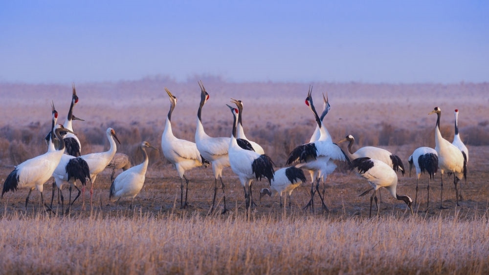 丹頂鶴等棲息在江蘇鹽城濕地珍禽國家級自然保護(hù)區(qū)。