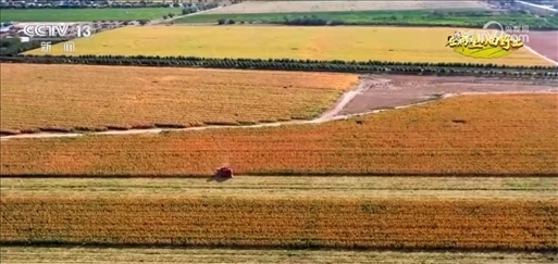 從和田市吉亞鄉(xiāng)上空俯瞰,沃野千里,一片金黃,一臺臺收割機(jī)正在忙著收玉米。今年,當(dāng)?shù)厥状瓮度肴詣哟笮陀衩资崭顧C(jī),可以做到收割、剝皮、去芯、分離、脫粒一氣呵成,一次可以收割十四行玉米,大大提高了作業(yè)效率。