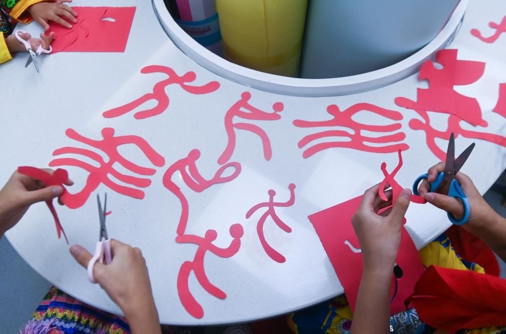9月13日,孩子們在老師的帶領(lǐng)下創(chuàng)作亞運(yùn)會運(yùn)動項(xiàng)目的主題剪紙作品。新華社記者 徐昱 攝