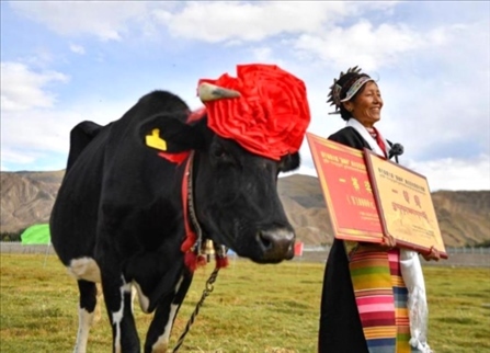 第六屆“聶雄杯”西藏高原·隆子黑白花優(yōu)質(zhì)奶牛競(jìng)賽在西藏山南市隆子縣進(jìn)行決賽。按照早晚各一次現(xiàn)場(chǎng)擠奶稱總量計(jì)算、體形外貌和系譜檔案三條指標(biāo)進(jìn)行評(píng)比,一頭名叫“扎西”的奶牛奪冠。
