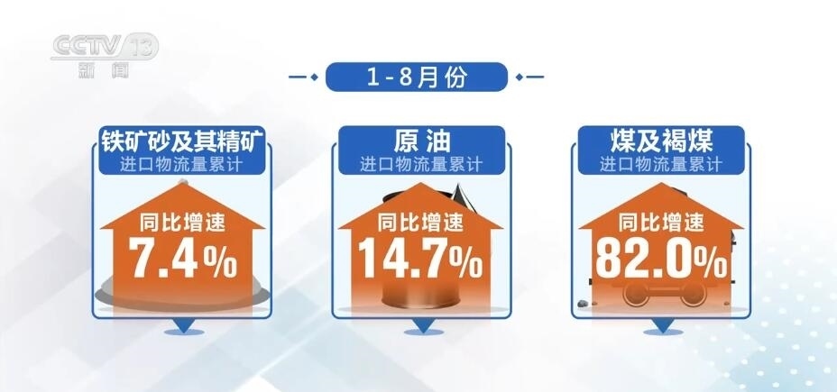 從進口來看,隨著內(nèi)需改善,進口物流也呈現(xiàn)量價回升。1—8月份進口物流總額同比增長14.4%,增速持續(xù)回升。從產(chǎn)品結(jié)構(gòu)看,原材料等大宗商品進口增速有所加快,鐵礦砂及其精礦、原油、煤及褐煤進口物流量累計同比增速分別為7.4%、14.7%、82.0%。