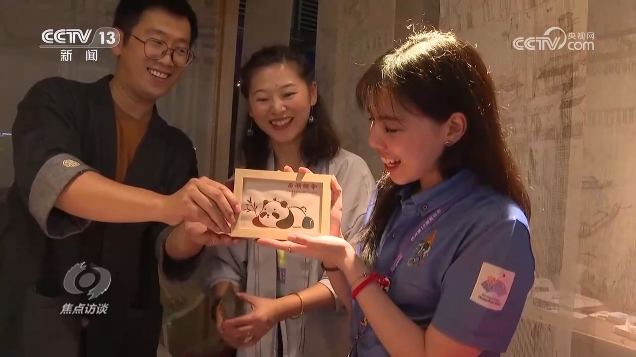 村里的文化市集里同樣熱鬧非凡,竹編、剪紙、皮影戲……每一個(gè)展位面前都圍著不少外國運(yùn)動(dòng)員。來自泰國的擊劍運(yùn)動(dòng)員正在體驗(yàn)綢傘刷花。在刷子涂上顏料,再和絲網(wǎng)進(jìn)行充分摩擦,顏料就會(huì)透過刻板平鋪在畫布上,精美的熊貓圖案就做出來了。當(dāng)?shù)弥@是綢傘上的技術(shù)時(shí),運(yùn)動(dòng)員班提達(dá)十分驚訝。