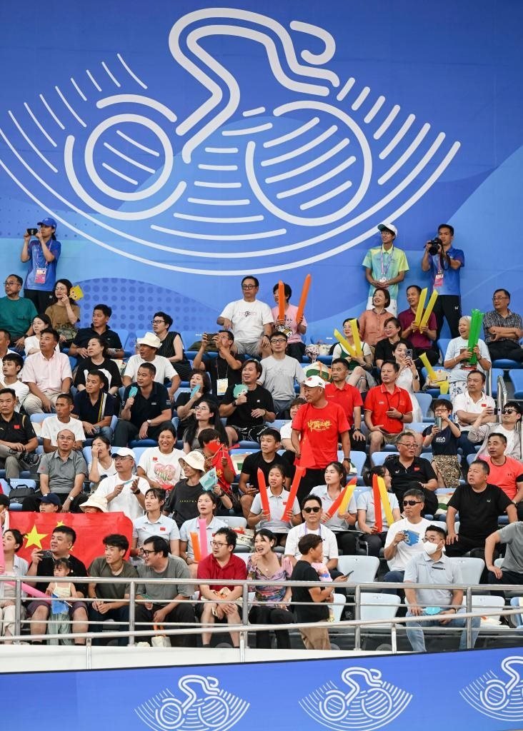 9月26日,觀眾在杭州亞運(yùn)會(huì)場(chǎng)地自行車男子團(tuán)體競(jìng)速賽場(chǎng)邊觀賽。新華社記者 胡虎虎 攝