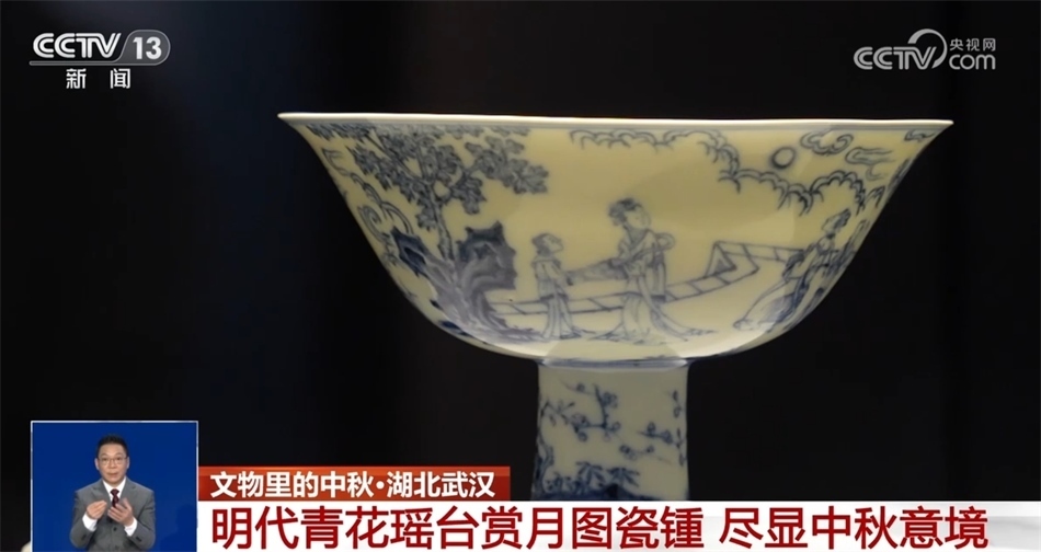 湖北省博物館珍藏的這件明代青花瑤臺賞月圖瓷鍾,造型獨(dú)特、工藝精湛,繪有遠(yuǎn)山、祥云、花草以及三組人物,這三組人物共賞一輪圓月,意境優(yōu)美。