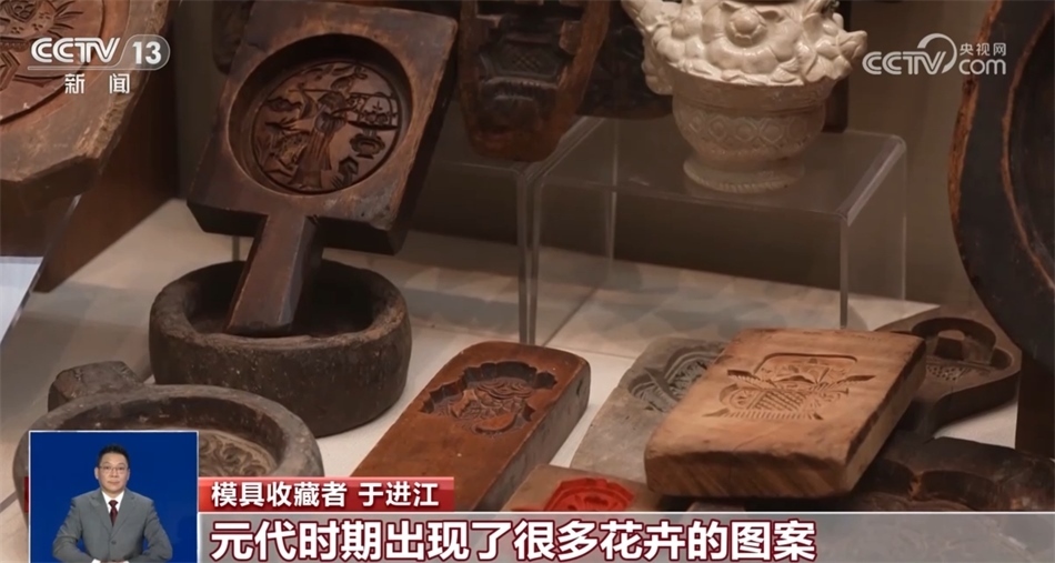 模具收藏者 于進(jìn)江:從宋代開始,我們會發(fā)現(xiàn)模具里面就出現(xiàn)了玉兔搗藥的造型;元代時(shí)期出現(xiàn)了很多花卉的圖案;到了明代時(shí)期,加入了很多題材,有期盼中秋節(jié)蟾宮折桂的,有祝壽團(tuán)圓的;清代時(shí)期,(出現(xiàn)了)很多故事圖案月餅。