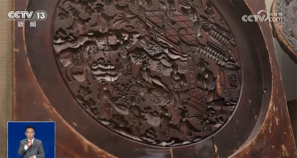 總臺記者 羅子瑛:瞧,我發(fā)現(xiàn)的這塊月餅?zāi)>咦龀鰜淼脑嘛炛睆侥軌蜻_(dá)到五六十公分,上面雕刻的花紋記錄了一位新科狀元回家為母親祝壽的場景??梢哉f月餅這樣一種食物,是用最樸素的方式記錄了人們的美好生活。