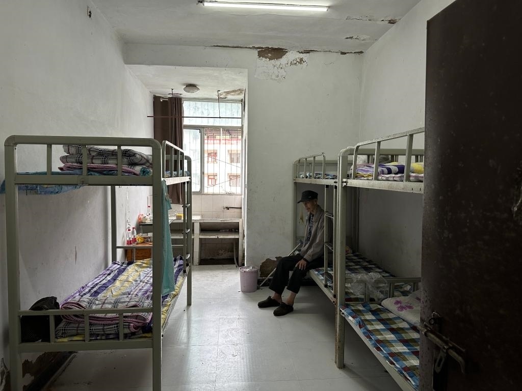 太白西村4組村民譚建和老爺爺行動(dòng)不便,坐在鋪著干凈格子床單的宿舍床上望向窗外?!扒疤煜挛?,社區(qū)的車來接的我和老伴,安置點(diǎn)吃喝都好,宿舍住起來也挺舒服。兒子們擔(dān)心我,他們過不來,一天就打好幾通電話,我說都好著呢、好著呢?!弊T爺爺說。