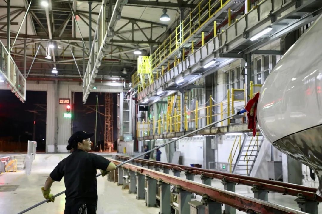動車組經(jīng)過洗車機(jī)時,調(diào)度室內(nèi)調(diào)度員精準(zhǔn)聯(lián)控司機(jī),機(jī)房有專業(yè)的設(shè)備操作人員負(fù)責(zé)監(jiān)控,確保洗車機(jī)正常運(yùn)轉(zhuǎn),外皮清洗到位。在動車檢修庫內(nèi),質(zhì)檢員全方位卡控人工清洗環(huán)節(jié),檢查清潔是否到位。