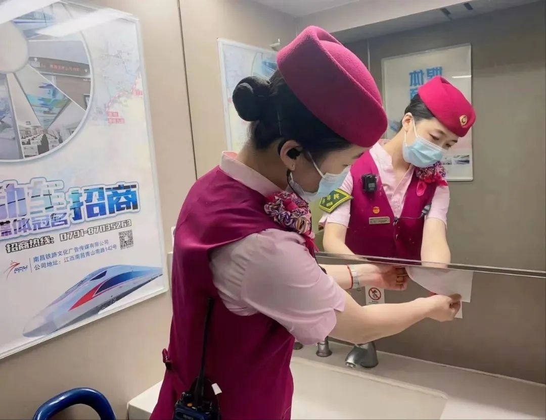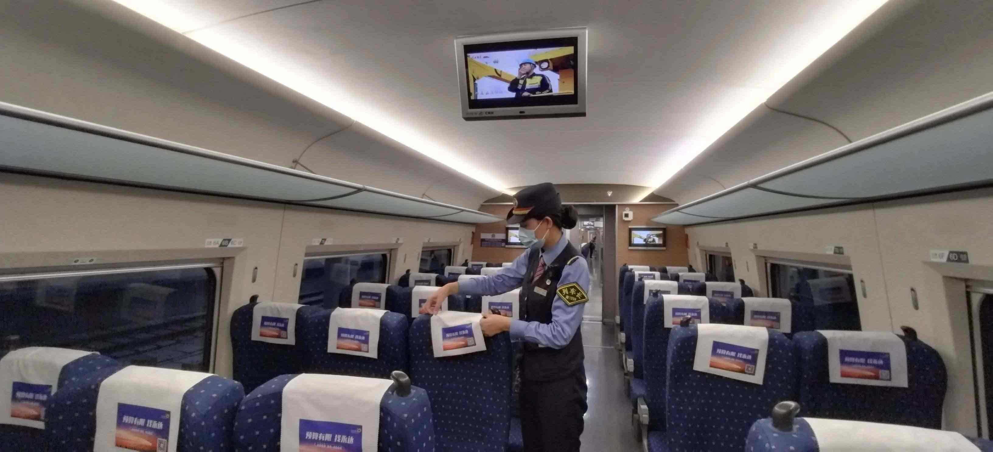 除了車身硬件的“美妝”,在列車上線始發(fā)前,列車乘務(wù)人員還要檢查各類客運(yùn)服務(wù)備品、衛(wèi)生備品等是否準(zhǔn)備齊全。他們需要保證車座椅背后網(wǎng)兜清潔袋擺放整齊,小桌板統(tǒng)一收起,頭枕巾和椅套擺放平整、干凈、無污染。