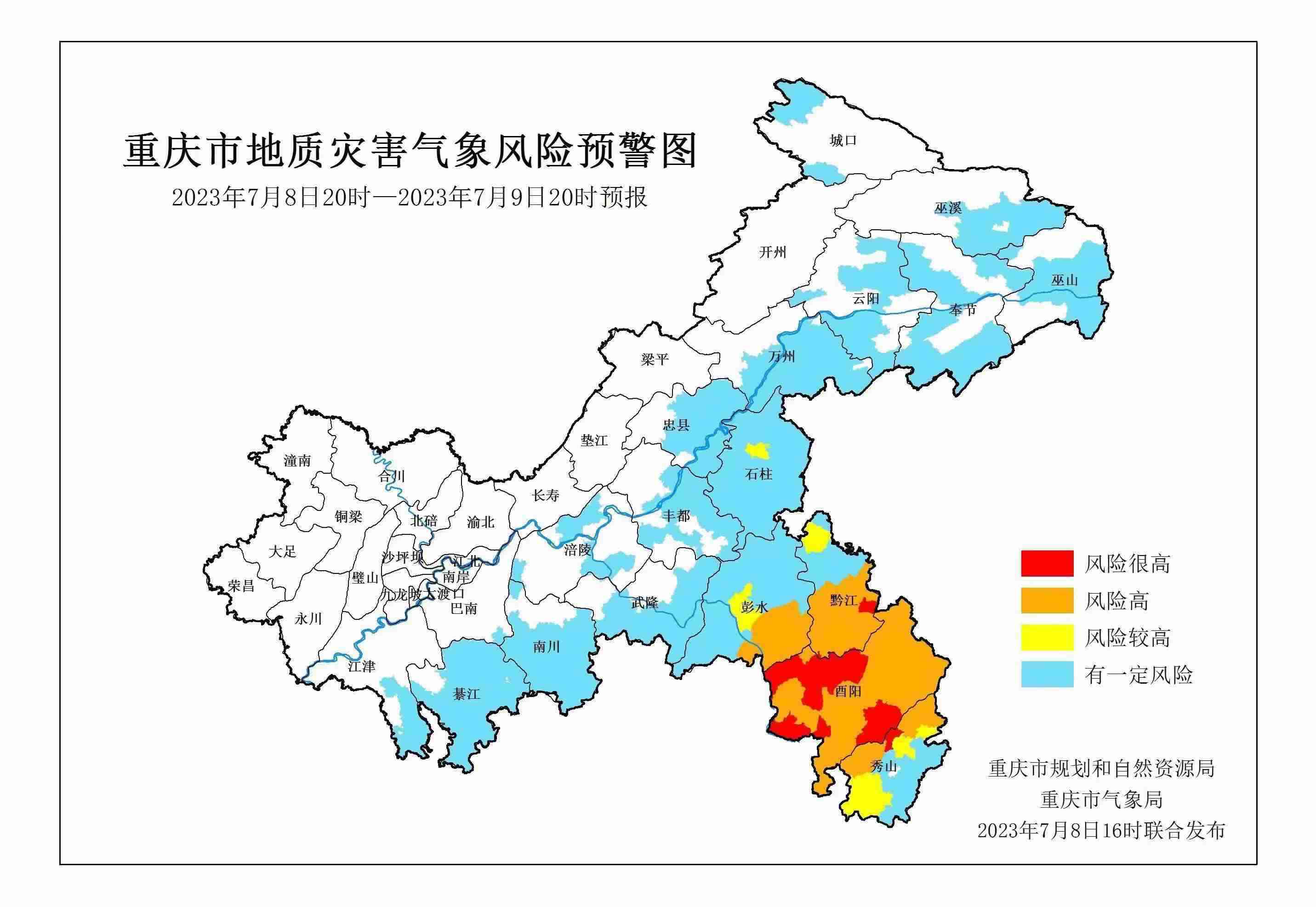 7月8日16時,重慶市規(guī)劃和自然資源局、重慶市氣象局聯(lián)合發(fā)布全市地質災害氣象風險預警。