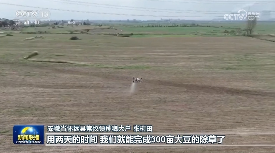 今年,皖北大豆主產(chǎn)區(qū)持續(xù)推進單產(chǎn)提升行動。在安徽懷遠縣種糧大戶張樹田的300畝大豆田里,無人機、植保機正在除草。由于夏播時全部采用大豆根瘤菌拌種,豆苗出得更齊、更壯。