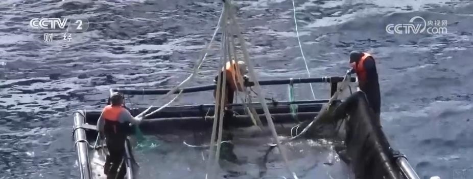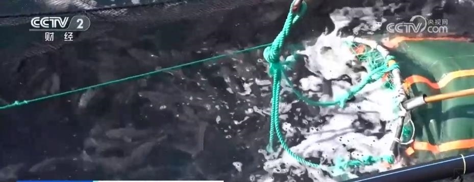 在煙臺(tái)長(zhǎng)島南隍城海域,隨著經(jīng)海系列深水網(wǎng)箱里魚類的成熟,一場(chǎng)在大海上的收獲正在進(jìn)行。起降機(jī)將一個(gè)個(gè)裝滿魚兒的巨大網(wǎng)兜轉(zhuǎn)移到運(yùn)輸船上,2.5萬(wàn)尾近4萬(wàn)斤的成品黑鲪魚,將從這里銷往全國(guó)各地。