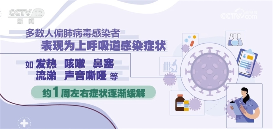 《人偏肺病毒感染診療方案(2023年版)》指出,人偏肺病毒感染者是主要傳染源。從潛伏期末到急性期都有傳染性。主要通過(guò)飛沫和密切接觸傳播,也可以通過(guò)接觸被病毒污染的物品間接傳播。人偏肺病毒人群普遍易感,在5歲以下兒童、老年人和免疫功能低下的人群中更為多見(jiàn),潛伏期為3天—9天,多為3天—6天。多數(shù)人偏肺病毒感染者表現(xiàn)為上呼吸道感染癥狀,如發(fā)熱、咳嗽、鼻塞、流涕、聲音嘶啞等,約1周左右癥狀逐漸緩解。鑒于目前尚無(wú)證據(jù)證明有對(duì)人偏肺病毒有效的特異性抗病毒藥物,不建議使用抗病毒藥物進(jìn)行治療。避免盲目或不恰當(dāng)使用抗菌藥物,尤其是聯(lián)合使用廣譜抗菌藥物。