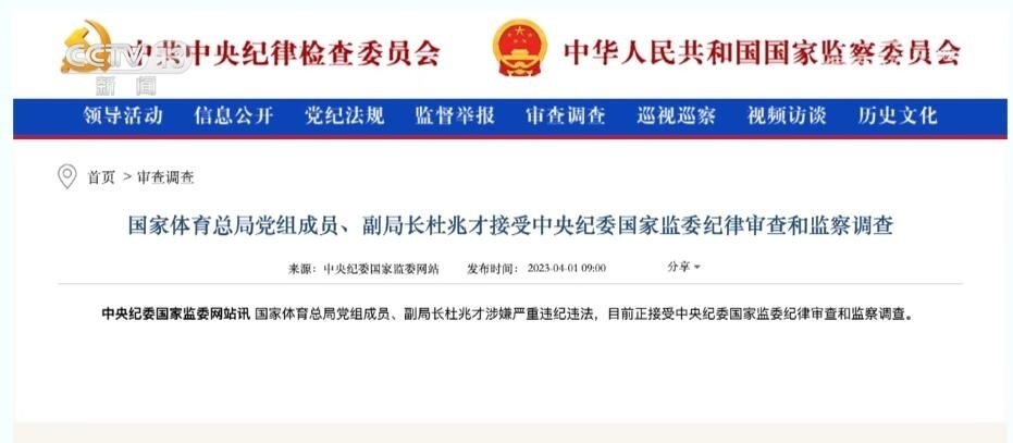 總臺央視記者 宋琎:今年3月27日,二十屆中央首輪巡視對象名單公布?!皩殷w育總局黨組開展機(jī)動巡視”這一消息迅速成為社會熱點(diǎn)。之后不到一周,中央紀(jì)委國家監(jiān)委通報,時任國家體育總局黨組成員、副局長杜兆才接受審查調(diào)查。體育領(lǐng)域反腐成為今年反腐敗工作的一大重點(diǎn)。