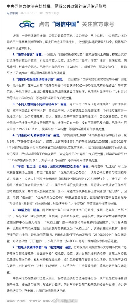 ·中央網信辦查處杜撰歪解公共政策造謠傳謠賬號,通報典型案例,共處置違法違規(guī)賬號373個。