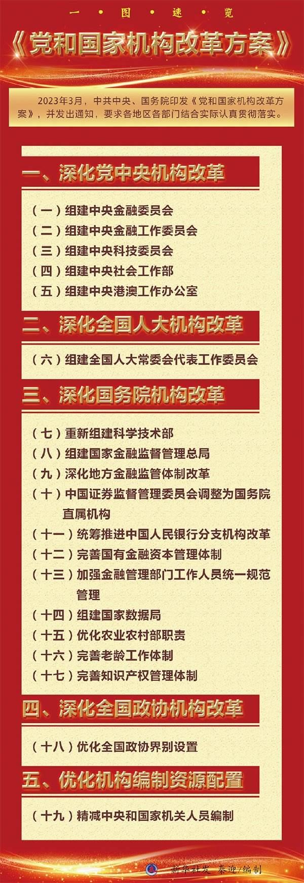 “這次機(jī)構(gòu)改革,是在黨的十九屆三中全會(huì)以來黨和國(guó)家機(jī)構(gòu)職能實(shí)現(xiàn)系統(tǒng)性、整體性重構(gòu)基礎(chǔ)上推進(jìn)的,同時(shí)也是在黨的二十大對(duì)今后5年乃至更長(zhǎng)時(shí)期黨和國(guó)家事業(yè)發(fā)展作出戰(zhàn)略部署的背景下研究謀劃的?!?/p>