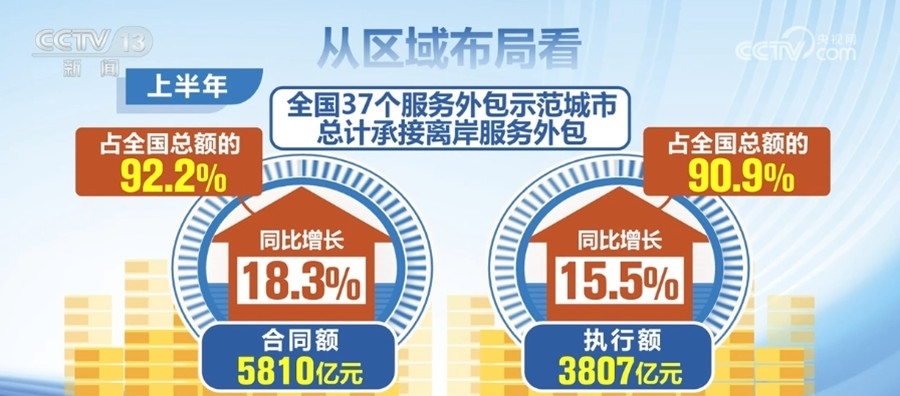 從區(qū)域布局看,上半年,全國37個(gè)服務(wù)外包示范城市總計(jì)承接離岸服務(wù)外包合同額5810億元,執(zhí)行額3807億元,同比分別增長(zhǎng)18.3%和15.5%,分別占全國總額的92.2%和90.9%。