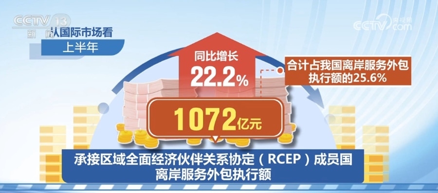 從國際市場(chǎng)看,上半年,承接區(qū)域全面經(jīng)濟(jì)伙伴關(guān)系協(xié)定(RCEP)成員國離岸服務(wù)外包執(zhí)行額1072億元,同比增長(zhǎng)22.2%,合計(jì)占我國離岸服務(wù)外包執(zhí)行額的25.6%。