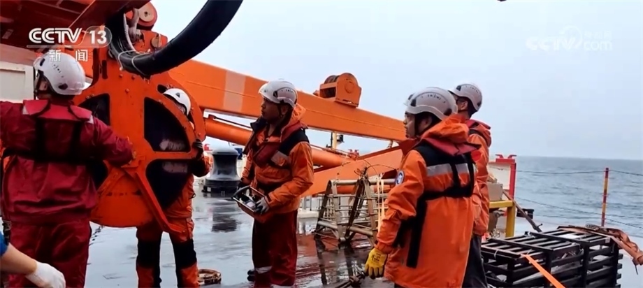 ?????? 而在艉甲板,科考隊員按次序站位,與科考甲板機械設(shè)備配合操作。