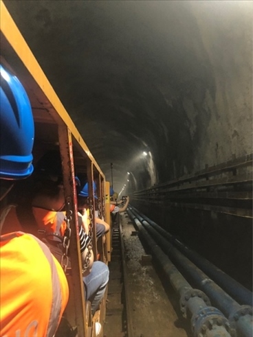 圖為采風(fēng)團(tuán)乘坐纜車(chē)前往江門(mén)中微子地下實(shí)驗(yàn)室。(新華網(wǎng) 王慰攝)