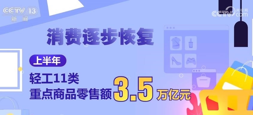消費逐步恢復(fù)。上半年,輕工11類重點商品零售額3.5萬億元,占社會消費品零售總額的15.4%,同比增長6.3%。
