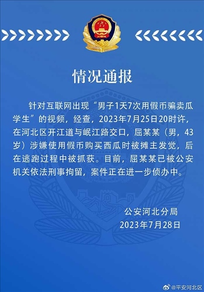 ·男子1天7次用假幣騙賣瓜學生?天津警方通報。