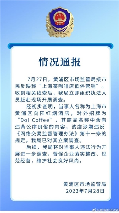 ·上海黃浦通報“咖啡店低俗營銷”:違背公序良俗,已立案調查。
