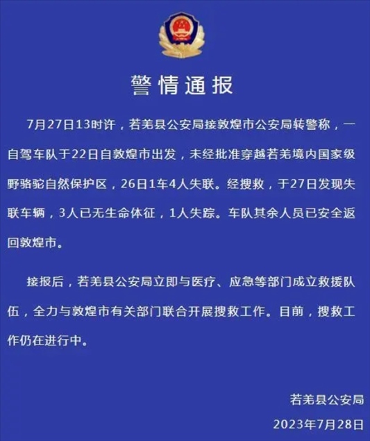 ·新疆若羌縣警方通報一車隊未經批準穿越自然保護區(qū):3人無生命體征,1人失蹤。