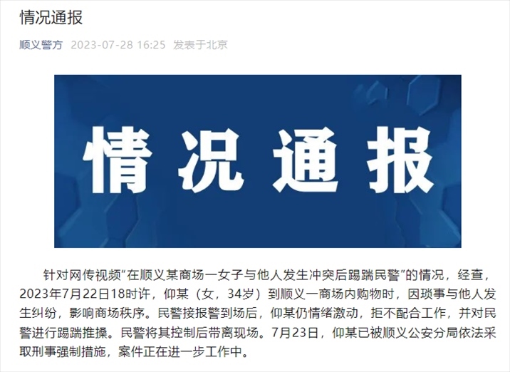 ·網傳“北京順義某商場一女子與他人發(fā)生沖突后踢踹民警”,警方通報。