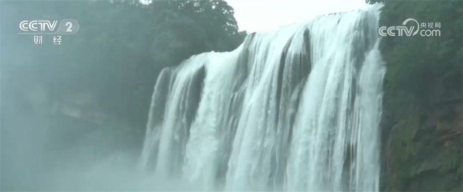 貴州臺(tái)記者 龍靜宜:現(xiàn)在黃果樹瀑布的水量非常充足,也是受到了持續(xù)降雨和上游來水的影響,傾瀉而下的瀑布水勢(shì)非常浩大,升騰而起的水汽,我現(xiàn)在離它100多米都能夠感覺到水汽在我身旁彌漫。
