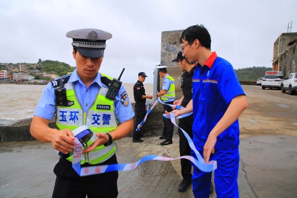 7月27日,民警、交警在浙江省玉環(huán)市應東碼頭設置警戒線。新華社發(fā)(段俊利攝)