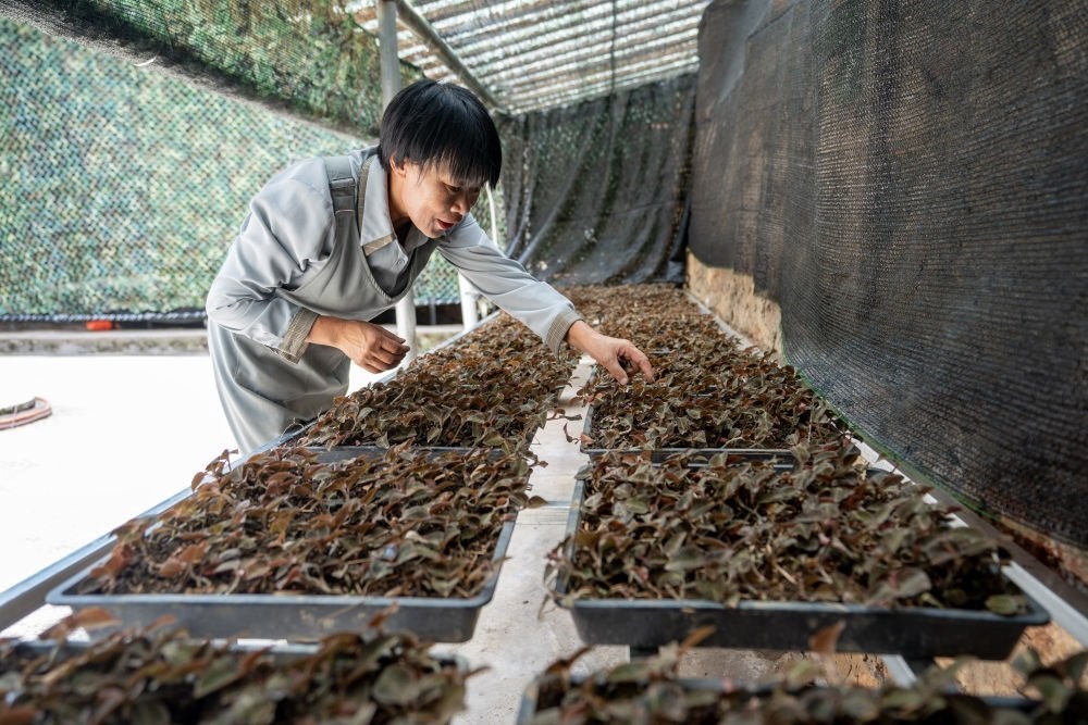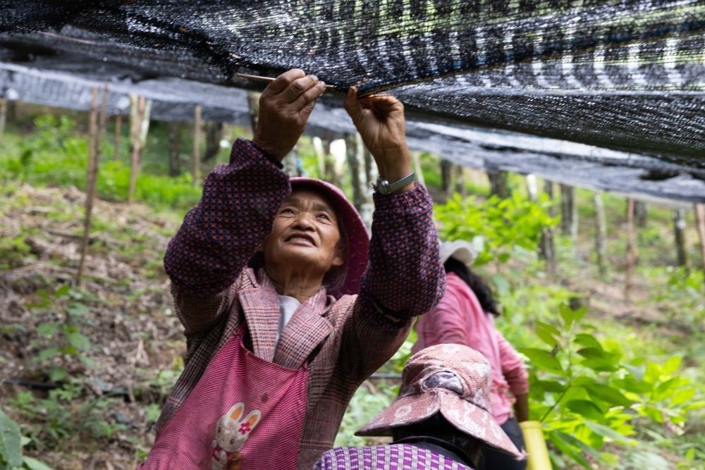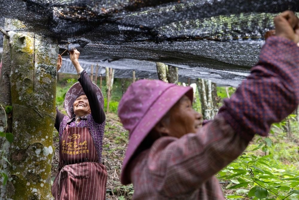 7月27日,工作人員在云南西疇縣西灑鎮(zhèn)的中藥材基地修補(bǔ)遮陽網(wǎng)。新華社記者 呂帥 攝