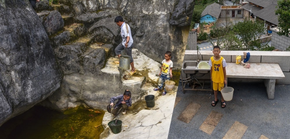 拼版照片:左圖為2014年拍攝的西疇縣巖頭村村民在石頭凹里取水,這些水是下雨時(shí)積的,當(dāng)時(shí)小村民李大鑫(右)只有5歲(西疇縣融媒體中心供圖);右圖為2023年7月26日拍攝的西疇縣巖頭村村民李大鑫在自己家的院子里接自來水(新華社記者 費(fèi)茂華 攝)。