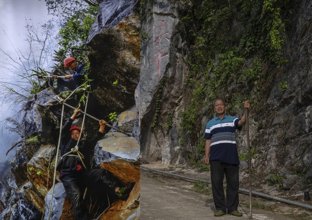 拼版照片:左圖為2008年李華明(下)和同伴在修路時(shí)在懸崖上打炮眼的資料照片(西疇縣融媒體中心供圖);右圖為2023年7月26日李華明在修好的出村路上留影(新華社記者 費(fèi)茂華 攝)。