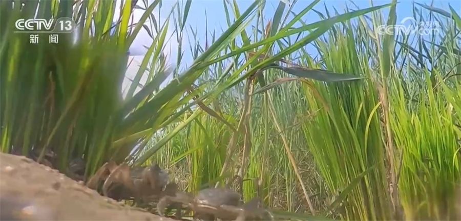 除了這群開心干活的鴨子,記者在稻田里還看到了螃蟹的身影,王千士說,起初稻田里最先養(yǎng)的是螃蟹,他想著利用螃蟹吃草吃蟲??墒屡c愿違,放進稻田的螃蟹犯了懶,躲進水里不干活,原來是螃蟹在邊溝里待著太舒服。第二年,王千士根據(jù)專家建議把溝挖深,同步養(yǎng)起了魚,螃蟹為了防止魚傷害自己,一個個從邊溝爬出來,進入稻田之中。