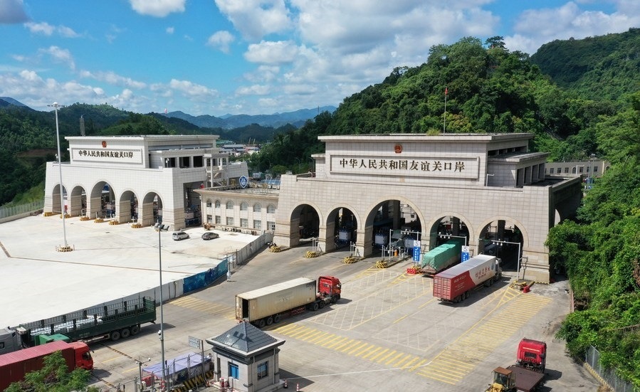 這是在廣西憑祥友誼關(guān)口岸通關(guān)的運輸車輛(無人機照片)。新華社記者 楊馳 攝