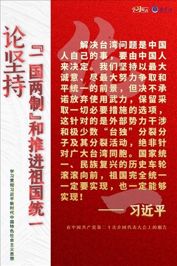 解決臺灣問題、實(shí)現(xiàn)祖國完全統(tǒng)一,是中國共產(chǎn)黨矢志不渝的歷史任務(wù),是全體中華兒女的共同愿望,是實(shí)現(xiàn)中華民族偉大復(fù)興的必然要求。必須堅(jiān)持貫徹新時(shí)代黨解決臺灣問題的總體方略,牢牢把握兩岸關(guān)系主導(dǎo)權(quán)和主動(dòng)權(quán),堅(jiān)定不移推進(jìn)祖國統(tǒng)一大業(yè)。