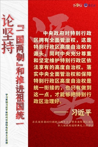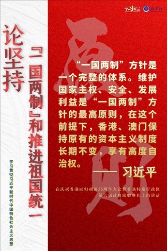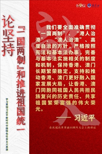 “一國兩制”是黨領(lǐng)導(dǎo)人民實(shí)現(xiàn)祖國和平統(tǒng)一的一項(xiàng)重要制度,是國家的一項(xiàng)基本國策。中國特色社會主義進(jìn)入了新時(shí)代,意味著“一國兩制”事業(yè)也進(jìn)入了新時(shí)代。不斷推進(jìn)“一國兩制”在香港、澳門的成功實(shí)踐,是中華民族偉大復(fù)興歷史進(jìn)程的重要組成部分。