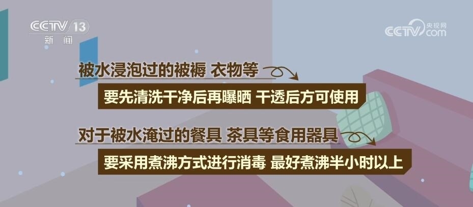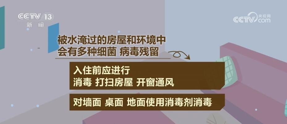 被水淹過的房屋和環(huán)境中會有多種細(xì)菌、病毒殘留,入住前應(yīng)進(jìn)行消毒,打掃房屋,開窗通風(fēng);對墻面、桌面、地面使用消毒劑消毒;被水浸泡過的被褥、衣物等,要先清洗干凈后再曝曬,干透后方可使用;對于被水淹過的餐具、茶具等食用器具,要采用煮沸方式進(jìn)行消毒,最好煮沸半小時以上。