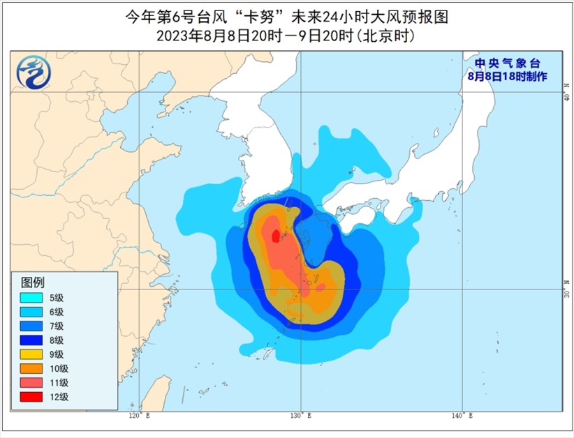 受“卡努”影響,8月8日至9日,巴士海峽、臺灣海峽北部、臺灣以東洋面、東海南部和東部及釣魚島附近海域有6級至7級大風(fēng),東海東部部分海域風(fēng)力可達(dá)8級至10級,“卡努”中心經(jīng)過的附近海域風(fēng)力可達(dá)11級至12級,陣風(fēng)13級至14級。