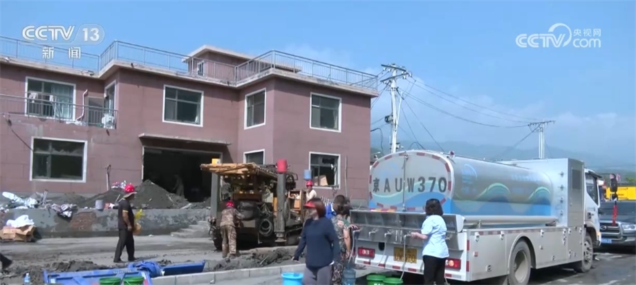在北京市房山區(qū)西班各莊村,由于洪水侵襲,當?shù)厮淳粵_毀,230戶村民出現(xiàn)飲水困難。當?shù)厮块T立即派出應(yīng)急送水車,同時集結(jié)勘探隊、機械設(shè)備,用最快的速度更新水源。?